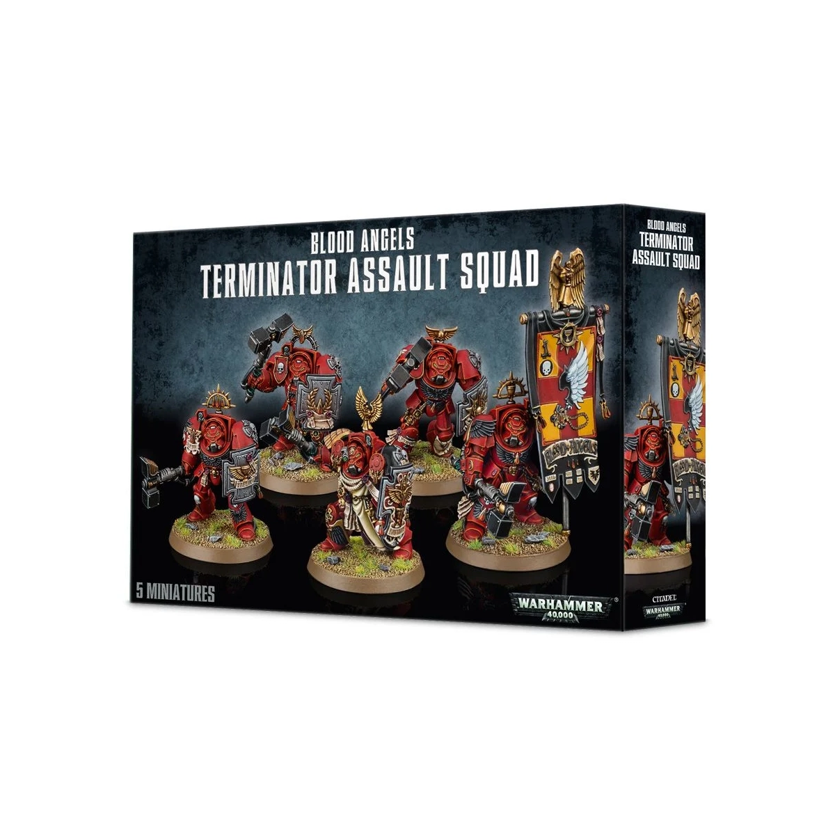 Ce kit plastique en 76 pièces permet d'assembler une Blood Angels Terminator Assault Squad de 5 hommes, armés de griffes Lightning ou de marteaux Thunder et de boucliers Storm. Les 5 paires différentes de griffes Lightning ont des ornements assortis sur les gantelets. Chaque marteau Thunder et bouclier Storm a un style différent, le sergent disposant d'un bouclier sensiblement plus grand que les autres. Il y a 5 épaulières gauches ornées de Crux Terminatus, et 8 épaulières droites différentes avec des icônes et symboles Blood Angels. Les épaulières peuvent être en outre décorées avec un choix de 12 écus. Quatre des moitiés frontales de torse sont moulées d'une pièce avec une tête casquée, et la cinquième est faite pour accueillir une des 5 têtes optionnelles du set. En outre, une figurine peut être assemblée en tant que porte-étendard de compagnie et il y a même une balise de téléportation fournie.