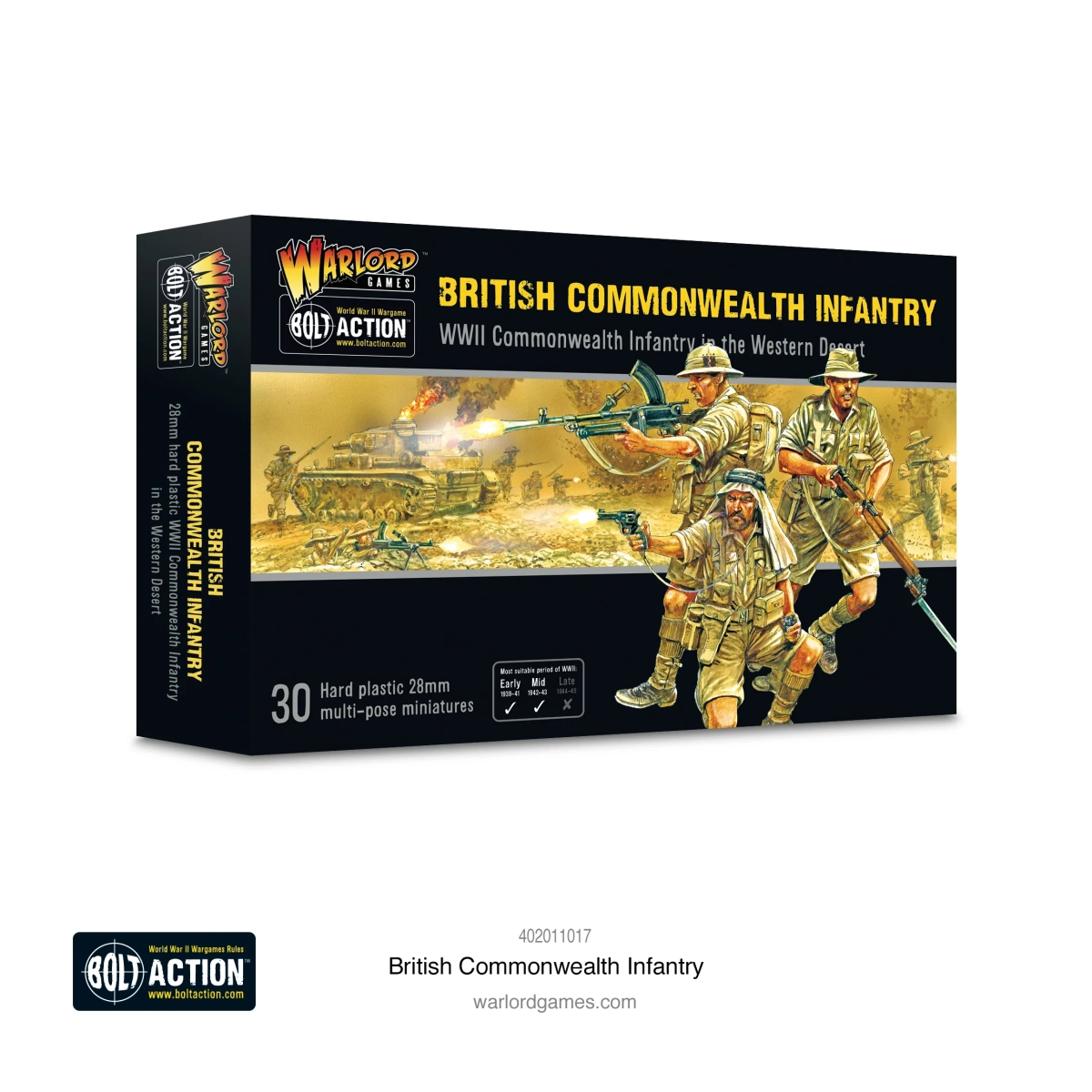 Utilisez les nouvelles figurines plastiques d’infanterie du British Commonwealth pour Bolt Action, basées sur la gamme 8e Armée, avec différentes options de têtes permettant de représenter des troupes australiennes, sud-africaines, néo-zélandaises ou encore du LRDG/SAS. De quoi stopper l’avancée des forces de l’Axe et affronter le célèbre « Renard du Désert », Erwin Rommel.