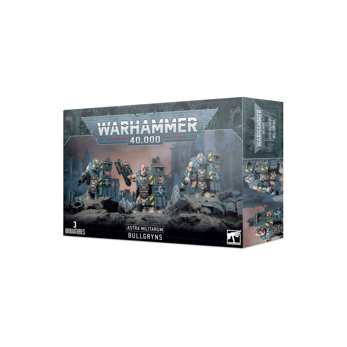Les abhumains nommés Bullgryns sont des créatures impressionnantes. Ils sont protégés par une armure carapace réalisée à partir de divers éléments, dont des patins de char Leman Russ, et leur armement rustique mais redoutable est si lourd qu'ils sont les seuls à pouvoir le manier.