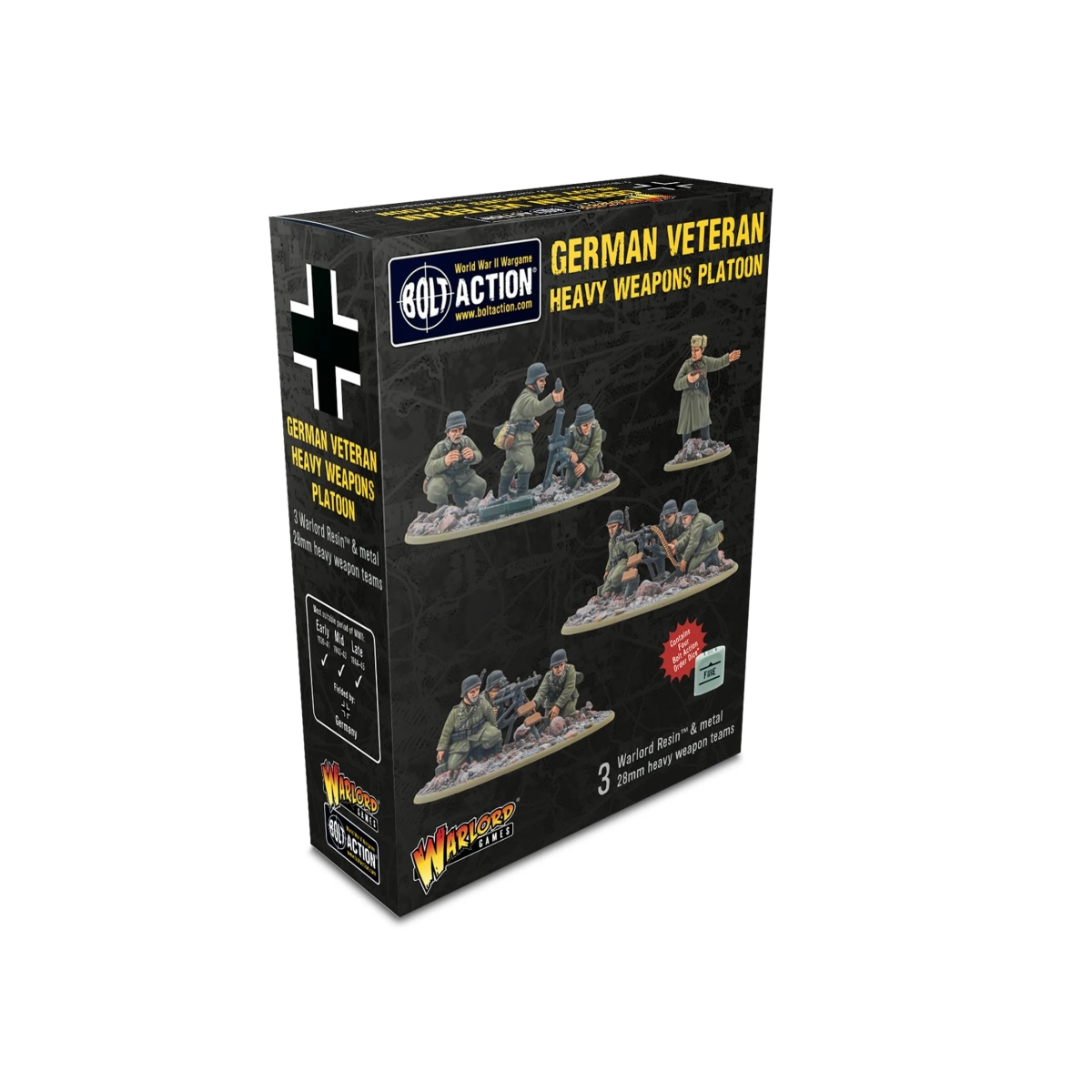 Cette boîte contient tout ce qu’il vous faut pour ajouter un Peloton d’armes lourdes à votre collection allemande de Bolt Action, avec des équipages vétérans assortis aux figurines de la boîte plastique.