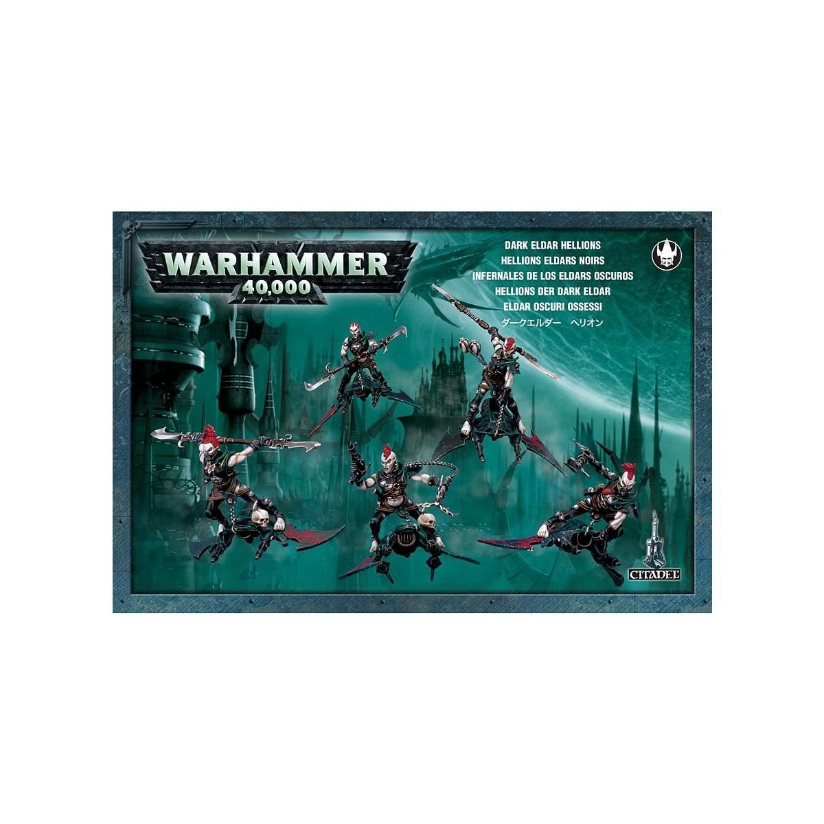Les Hellions sont des tueurs volants, les plus sauvages des Drukhari. Ils forment des gangs qui plongent sur leurs proies dans une fureur de lames barbelées avant de reprendre de l'altitude. Les Hellions vont au combat sur des surfs antigrav monoplace et prennent des drogues qui améliorent leurs facultés de réaction. Ils se jettent sur leurs ennemis terrorisés en hurlant des injures et en les démembrant avec leur vouge à la lame redoutablement aiguisée.