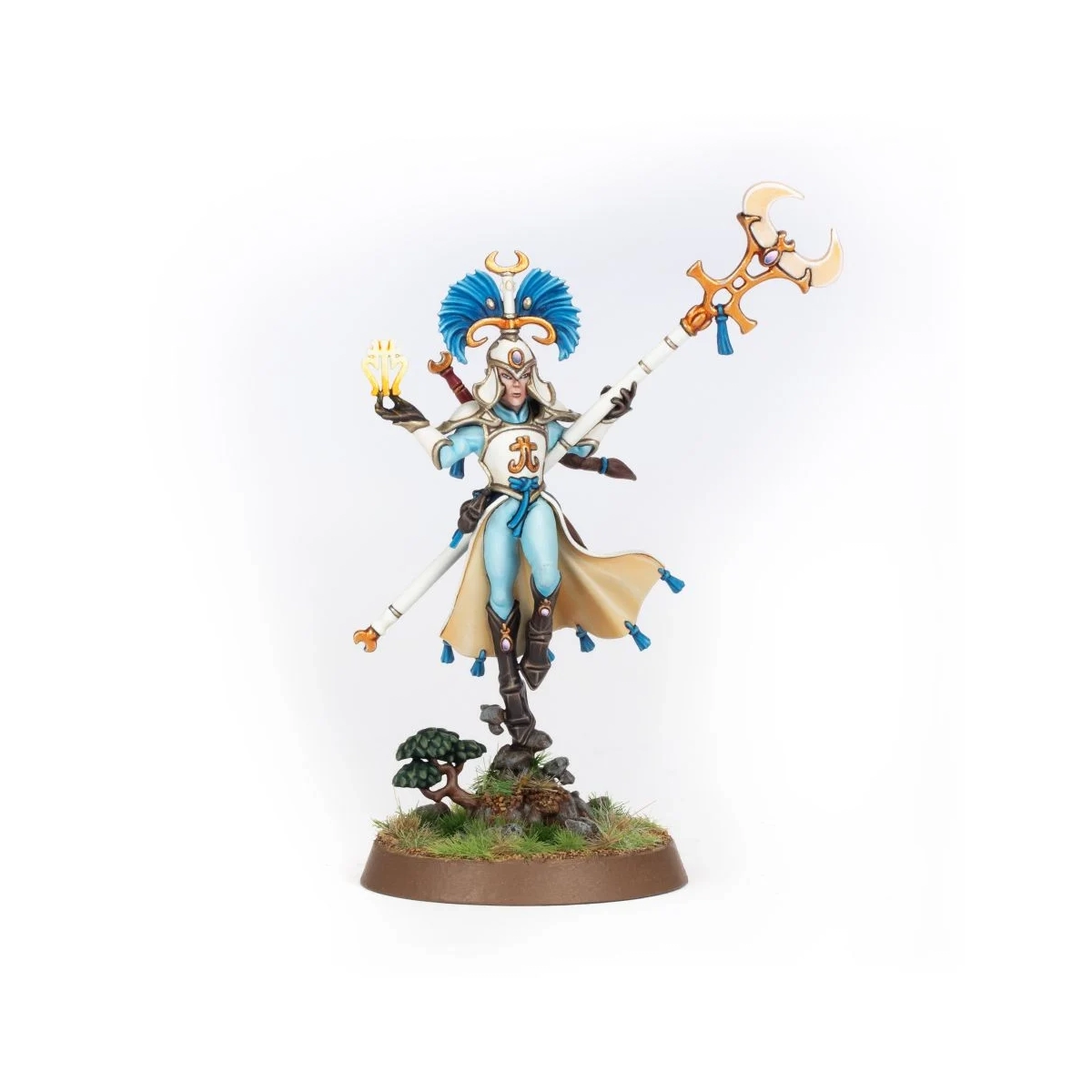 Ce kit plastique permet d'assembler un Illumineur Scinari, un talentueux maître de la sagesse mystique. Ce mage flotte au-dessus du sol, ses robes flottant derrière lui, tout en tenant la Rune d'Enthlai brûlante dans une main. Il manie un élégant bâton à tête en croissant capable d'incinérer les ennemis par des éclairs d'énergie, et il a une épée d'Illumineur accrochée dans le dos, prête à asséner un déluge de coups en combat rapproché. Le kit contient un choix de deux têtes, une avec un casque orné d'un impressionnant cimier, et une tête nue avec de longs cheveux tressés et un diadème délicat.