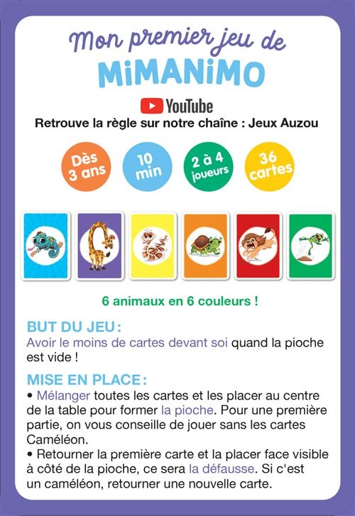Pose tes cartes en mimant l'animal joué : croa croa, fais sauter ta carte jusqu'à la défausse ! Débarrasse-toi du plus de cartes possible pour remporter la partie. Un jeu de mime et d'observation !