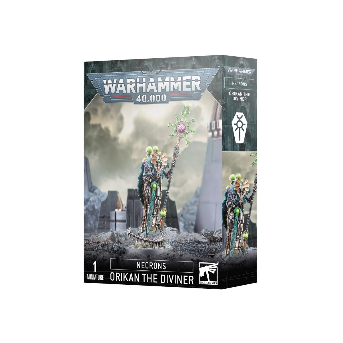 Ce kit plastique permet d'assembler Orikan le Devin, le plus grand Chronomancien de toutes les dynasties des Nécrons. Maintenu en l'air par sa colonne vertébrale préhensile, ce personnage légendaire porte un chronomètron actif ainsi que le Bâton d'Anachronie, un instrument temporel existant une demi-seconde avant l'instant présent et frappant avant même que son porteur bouge. Orikan est orné de sphères surnaturelles qui l'aident dans ses calculs divinatoires. Il est drapé d'une cape segmentée et arbore une impressionnante couronne digne d'un haut Cryptek.