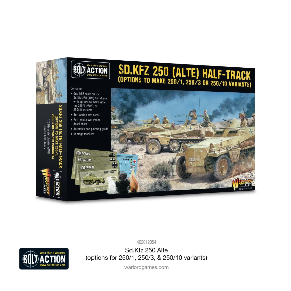Le Sd.Kfz 250/1 était un semi-chenillé de reconnaissance et de transport principalement utilisé par les unités de reconnaissance et les quartiers généraux. Ce véhicule était une version raccourcie de la célèbre série Sd.Kfz 251 Hanomag, et tout comme son cousin plus long, il existait de nombreuses variantes qui remplissaient différentes fonctions, telles que les transporteurs de câbles, les transporteurs de munitions et les transporteurs radio, entre autres. Il pouvait transporter six hommes, dont le conducteur et le co-pilote, et était armé de deux mitrailleuses MG34 montées sur supports pivotants : l'une était orientée vers l'avant et protégée par un bouclier, tandis que l'autre couvrait l'arrière et la zone aérienne.