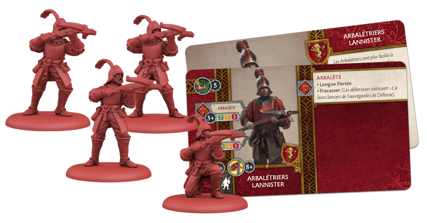 Les arbalétriers Lannister étendent la portée d’un commandant à travers le champ de bataille. du jeu A Song of Ice and Fire: Tabletop Miniatures Game contient 12 figurines miniatures dans quatre sculptures différentes, une carte d’unité et un plateau de mouvement. Cette unité de soldats à œil mort profite de la technologie disponible pour une famille de moyens. À courte ou longue portée, leurs boulons peuvent percer même une armure épaisse. Cependant, un commandant sage les éloignera des charges de mêlée, si possible.