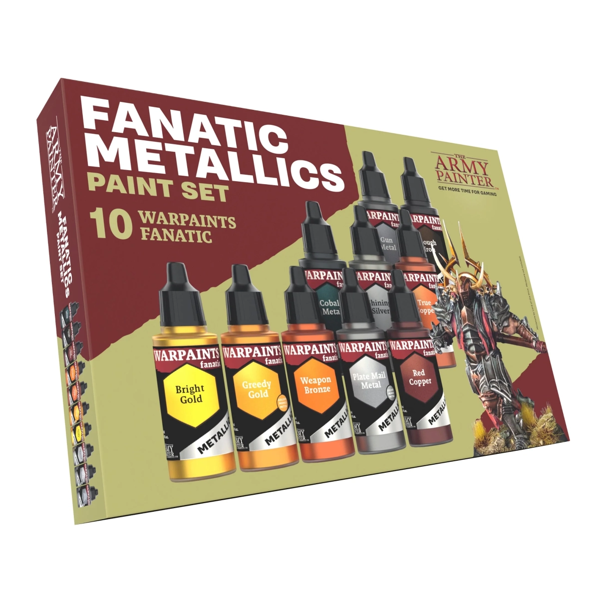 Les nouvelles peintures Fanatic Metallics utilisent la formulation exclusive "Al-crylic" de The Army Painter. Ce mélange spécialisé de paillettes d'aluminium et de mica offre la meilleure combinaison possible entre pouvoir couvrant et brillance. Le résultat est plus scintillant que les peintures métallisées traditionnelles, tout en étant plus opaque. Cette différence est flagrante sur les teintes comme l'or, qui nécessitent habituellement plusieurs couches pour un rendu propre.